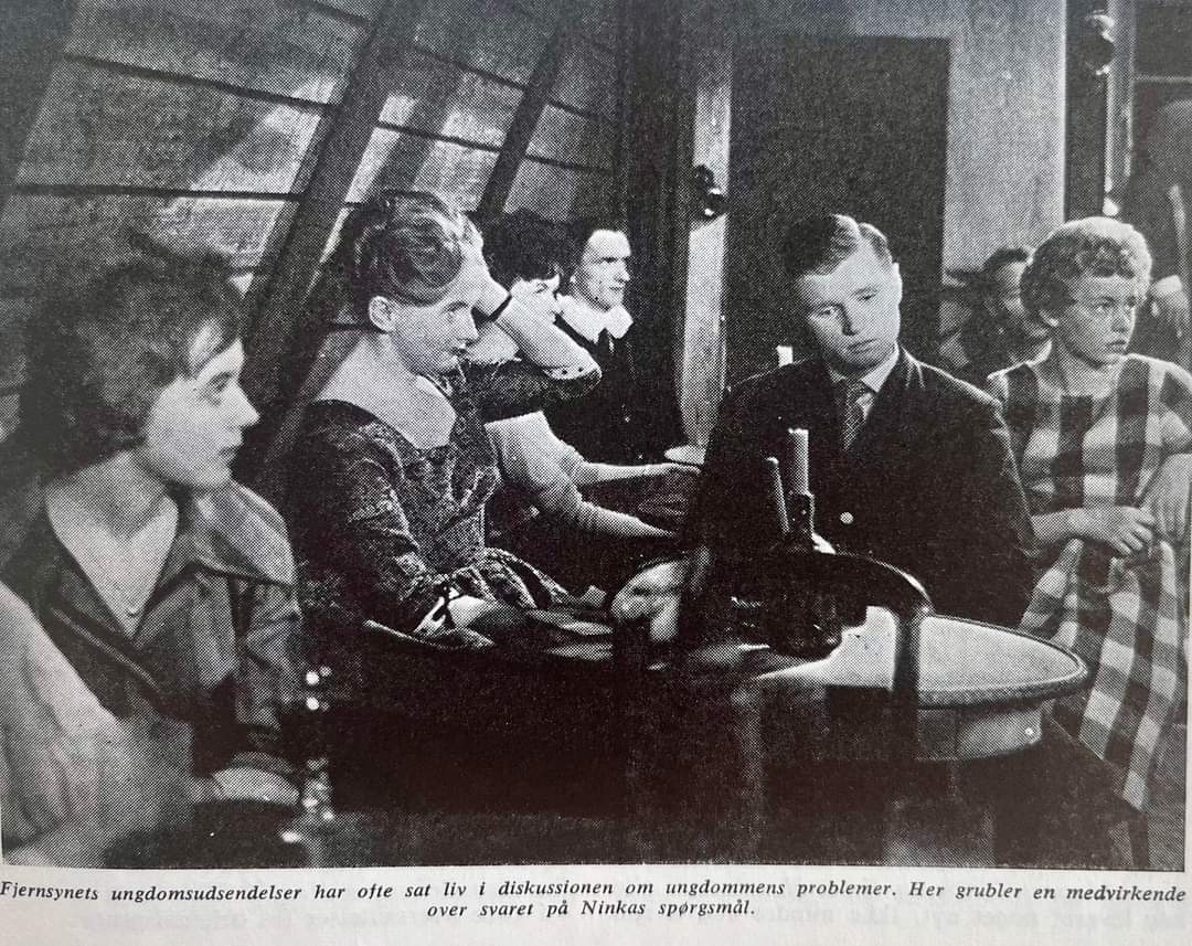 Danmarks Radio satte i 1960 i en stribe tv-udsendelser fokus på diskussionen om ungdommens problemer. På billedet, der ledsagede udsendelserne, grubler de medvirkende unge over verden og livet…