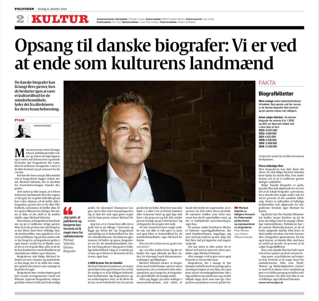 Jeg ville slå koldt vand i blodet. Og i øvrigt minde om at der faktisk er gode grunde til at biograferne ikke er kommet sig helt så godt efter coronaen som så mange andre kulturaktører – og det er ikke af mangel på innovation. Det er ejendommeligt nok slet ikke nævnt i artiklen, men alle i branchen har vidst, at 2023 og 2024 ville blive nogle svære år. Coronaens indvirken på de store amerikanske filmproduktioner har i forvejen gjort, at biograferne er bagud på ’produkt’-fronten – i særdeleshed de store, kommercielle biografer, der lever af de amerikanske film. Og efterslæbet er ikke blevet mindre efter den store strejke i Hollywood, der ifølge eksperter fra de kanter gjorde endnu større skade end selv coronaen.