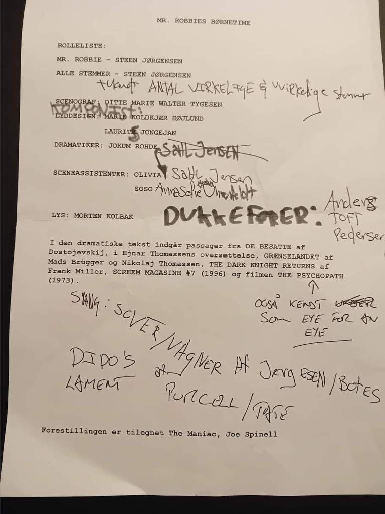 Holdet vil udforske traumeteatret ved at smelte lyd- og billedmættede fortælleformer sammen. Børnestemmer lyder fra radioen, Mr. Robbie sminker sig som klovn, et skrig looper, Steens Jørgensens rå rockstemme genfortæller historien om et klovneliv, pludselig står Mr. Robbie med blod på tøjet, et hævn-offers bekendelse lyder fra højtaleren, og så er vi med ét tilbage i de gode gamle dage med Mr. Robbies Børnetime. Playback, realtid, lyd og billede undersøges i et visuelt musikalsk værk, som kun er for svage sjæle.
