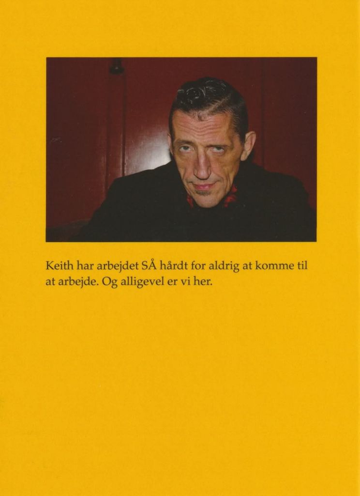 Af de intense og ofte ordrige tekster i “Mit navn er Keith” kunne man få det indtryk, at Keith Thomas Lohse ‘lider’ af et nærmest Tourettes-agtigt udtryksbehov. Men samtidig kan man forstå på bogens forord – og på de få interviews, der findes med digteren – at der (ikke overraskende) også lurer en hård opvækst med dysfunktionelle familieforhold og børnehjemsanbringelser bag den desperat-potente skrift, hvor cocky livsglæde hele tiden balancerer på kanten til at kæntre ind i et altopslugende mørke – eller er det omvendt? Måske er det de hårde livsvilkår, der har stået i vejen for, at Keith Thomas Lohse har fået (taget) den litterære karriere, som digtenes uomtvistelige kvalitet kunne have berrettiget til (det kan dog oplyses, at Lohse faktisk har fået udgivet endnu en bog, nemlig “Lithium Picnic”, et samarbejde med kunstneren Karl Kolind, der udkom på forlaget Gladiator i 2023). Men uanset hvad, så synes jeg, at det litterære landskab i Danmark sagtens kunne tåle meget mere Keith Thomas Lohse, og derfor slutter jeg af med yderligere tre (relativt korte) digte fra “Mit navn er Keith” – de kommer her: