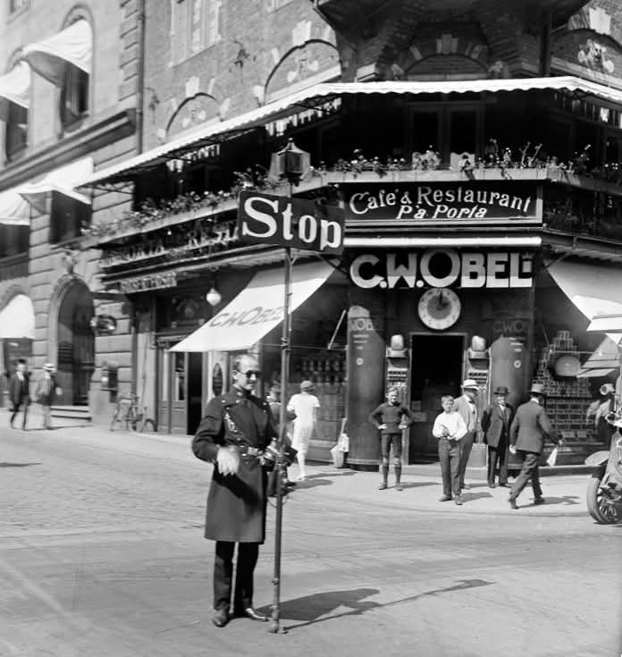 Restaurant ”P à Porta”, Nygade 6. I krydset regulerer en københavnsk færdselsbetjent trafikken med et manuelt stopskilt. Danmark fik sit første trafiklys i krydset Frederiksborggade/Farimagsgade i 1928.