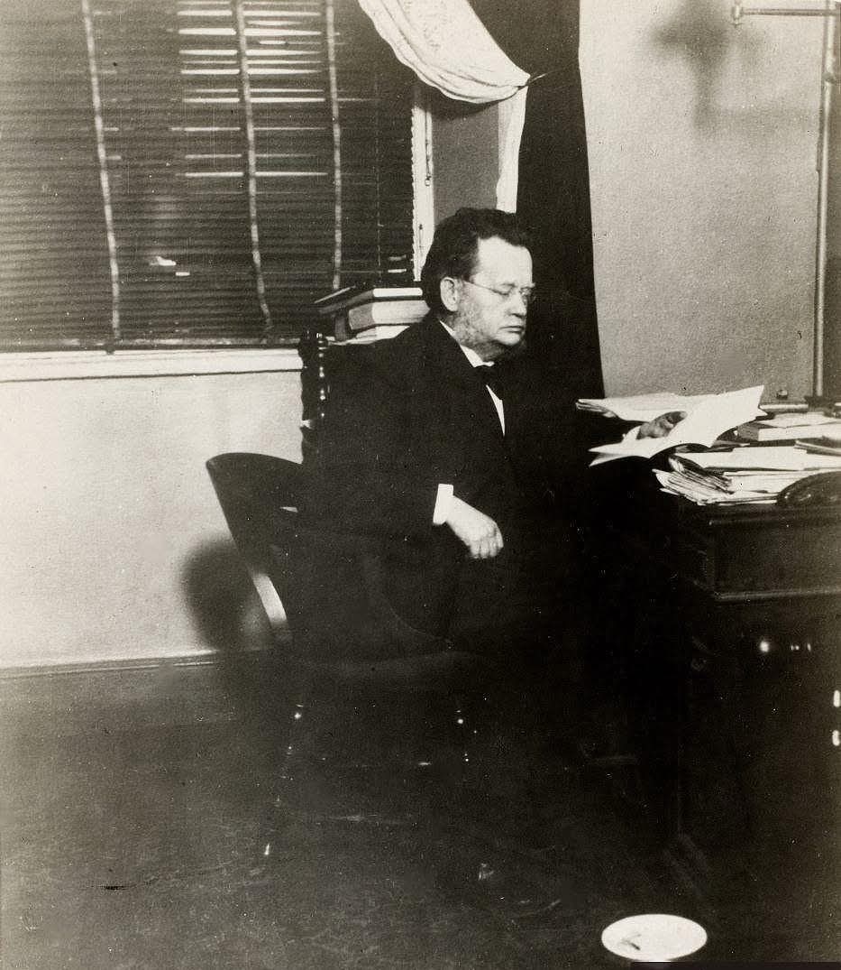 Finansborgmester Ludvig Christian Borup (1836 – 1903) på sit kontor på Københavns gamle Dom- og Rådhus, det nuværende Domhus på Nytorv. Dateret 1900. Borup var født som søn af en købmand og tobaksfabrikant i Randers. Han blev student 1854 og juridisk kandidat fra Københavns Universitet i 1859. Kort efter sin embedseksamen fik Borup ansættelse i Indenrigsministeriet, hvor han blev fuldmægtig 1868, ekspeditionssekretær året efter og kontorchef 1875.