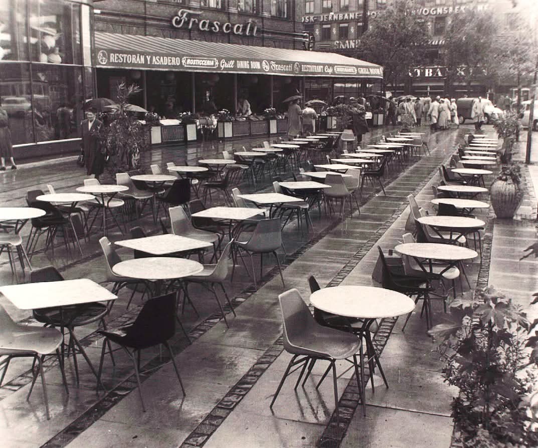 Som Storm P sagde ”alle taler om vejret, men ingen gør noget ved det”. Den erfaring har mange restauratører og gæster gjort de sidste dage. Det erkender man også tydeligvis her på ”La Rotisserie Frascati” på Rådhuspladsen engang i 1960-erne. Her var der allerede i 1908 indrettet en statelig overdækket fortovsstilling langs facaden. Men om sommeren, udnyttede restauranten hele den lille plads foran restauranten. I København har vi altid nydt, at side ude om sommeren. Især på Rådhuspladsen.
