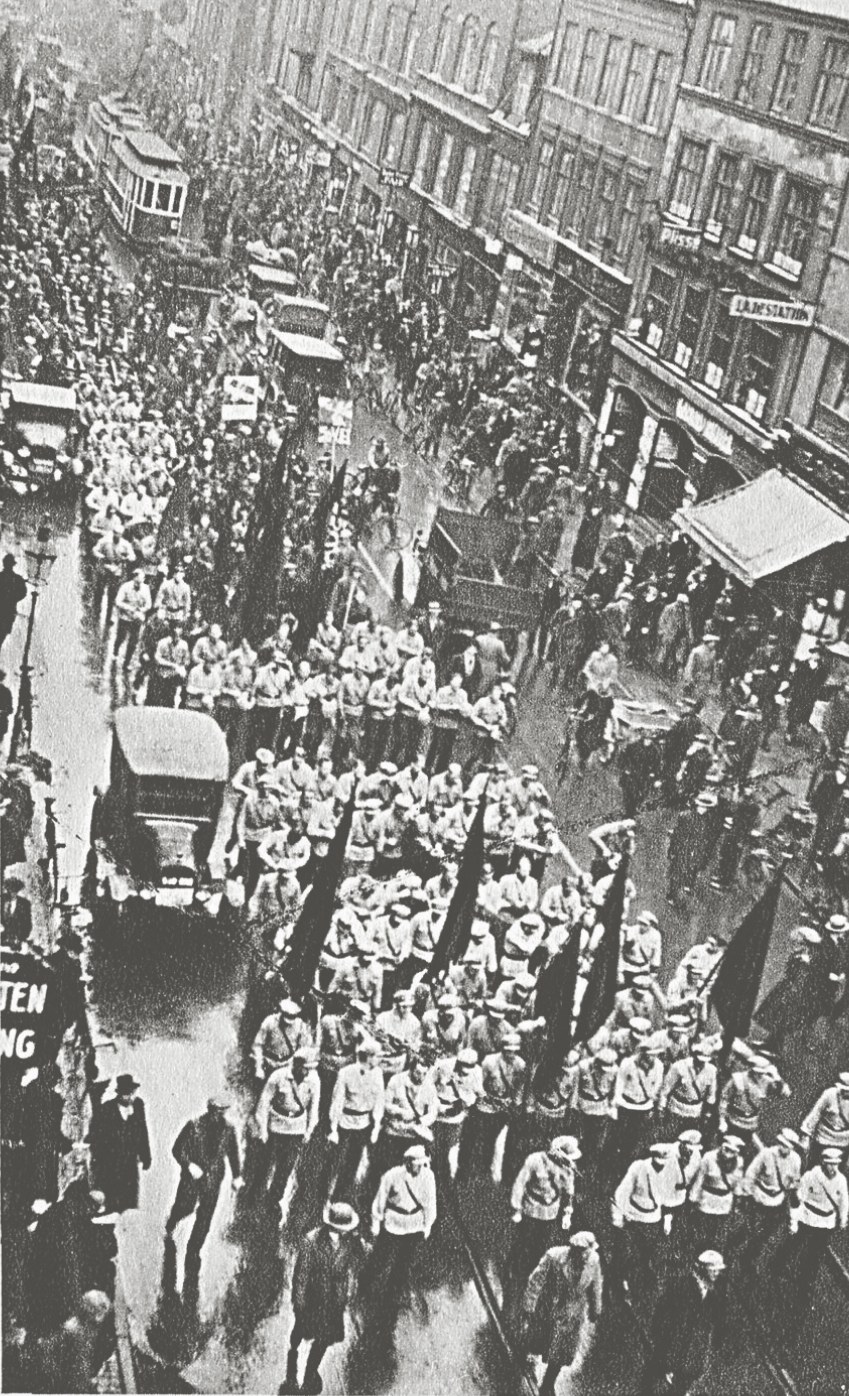 På Nørrebrogade ved Fælledvej i København, den 25. februar 1933, danner cirka 150 uniformerede kommunister fortrop for en demonstration på det, man kaldte ”Den røde Dag”.