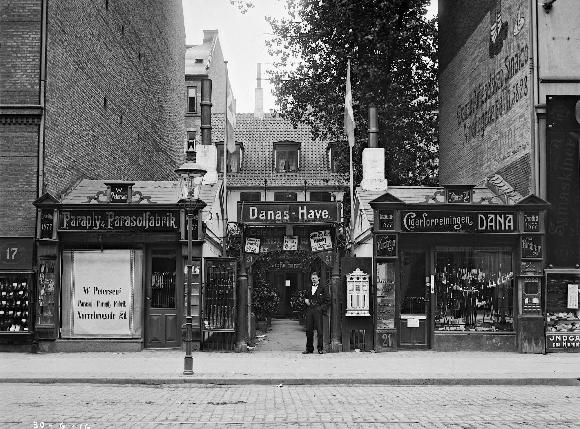 Danas Have lå på daværende Nørrebrogade 21, som efter ny-nummereringen af gaden, fra 1935 var Nørrebrogade 11. I forhaven ud til gaden blev opført to små bazarbygninger, hvor der var paraply- og cigarbutik. De var begge etableret i 1877. Måske det også gjaldt for Danas Have. Prisskiltene fortæller, at gæsterne i Danas Have kunne få en sjus for 25 øre med Whisky og Cognac.