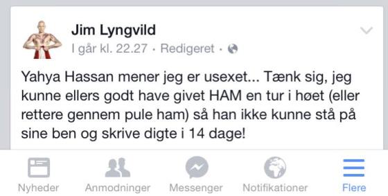 Yahya Hassan skriver på Facebook: Jim Lyngvild skriver at han gerne vil røvpule mig så jeg ikke kan stå på … Mere