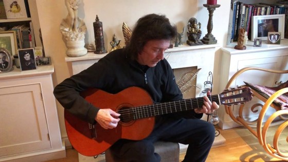 Steve Hackett spiller akustisk guitar derhjemme
