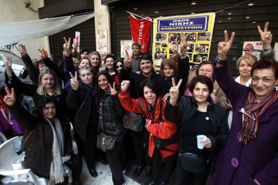 Græske rengøringsdamer med røde handsker fejrer at de har fået deres jobs tilbage