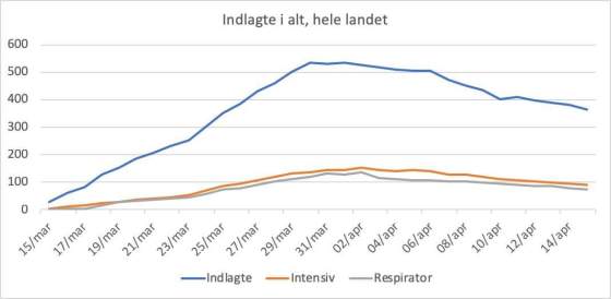 Onsdag den 15. april, indlagte og døde: Tallet for indlagte fortsætter med at falde i alle kategorier til 362 indlagte … Mere
