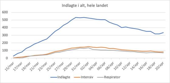 Tal for indlagte og døde, 20/4: Indlagte stiger med 17 til 336. Det er første reelle stigning, siden kurven toppede … Mere