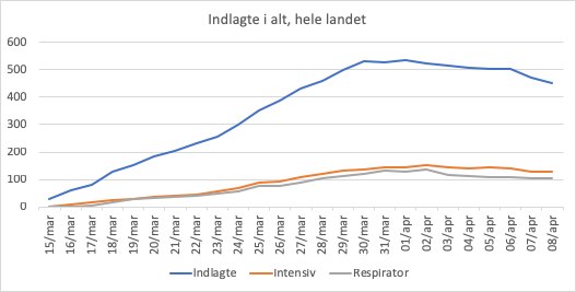 Af Frederik Wiedemann Onsdagens tal for indlagte og døde: Det samlede antal indlagte fortsætter med at falde til 453 (-19 … Mere