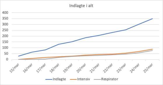 Onsdagens tal: 350 indlagte er 49 flere end i går, hvor stigningen var på 47. De foregående tre dage var … Mere